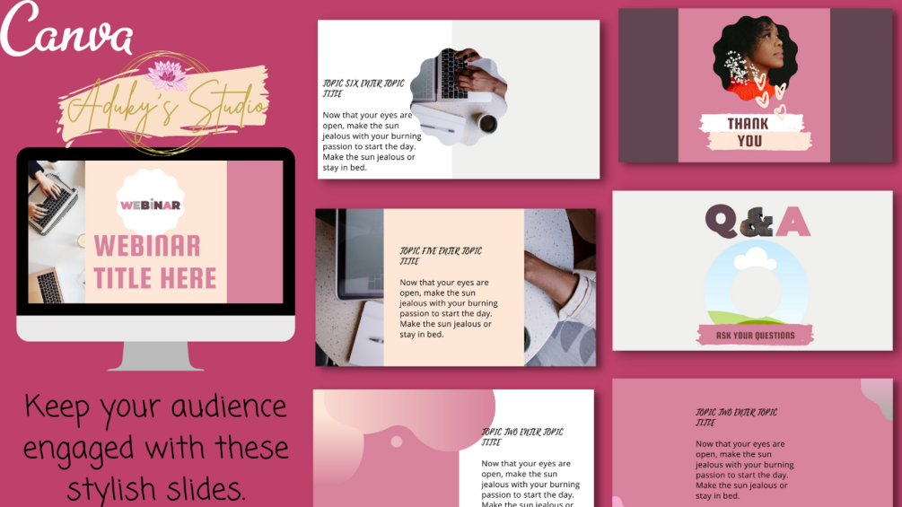 You’ll receive 43 Canva coaching queen webinar slide deck templates made to simplify your life and help you reach your potential client with your/business offer today. With these templates there is no need to design your webinar or info session from scratch. Get these easy to edit templates, select and combine different slides to use during your webinar presentations, masterclasses, online course webinars, digital product presentations as well as to market your products and services.